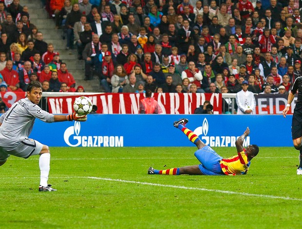 Para a estreia na Liga dos Campeões, o técnico Jupp Heynckes apostou na experiência. Jovens como Xherdan Shaqiri e Mandžukić – autor de três gols no Campeonato Alemão – foram sacados e deram lugar a Schweinsteiger e Claudio Pizarro. Em campo, muita pressão e pouca eficiência. Com Mário Gomez machucado, o Bayern dominou o jogo, teve 66% de posse de bola, mas pecou na pontaria na maior parte da primeira etapa. Foram nove finalizações, mas apenas dois chutes de fora da área de Toni Kross levaram dificuldades ao goleiro brasileiro Diego Alves, que fez bonitas defesas em ambos os lances.